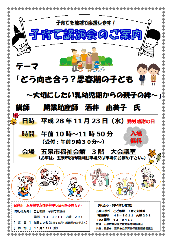 「どう向き合う?思春期の子ども~大切にしたい乳幼児期からの親子の絆~」をテーマに子育て講演会を開催します。皆様ぜひご参加ください。